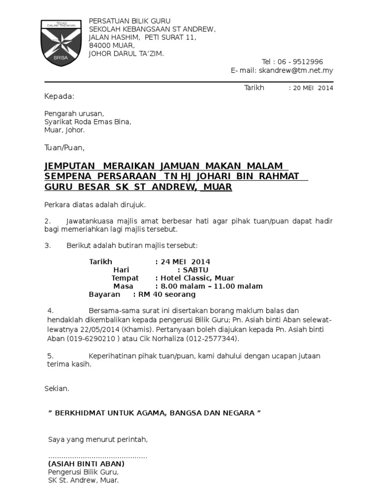 Contoh Surat Jemputan Majlis Kahwin - Special post buat kawan2 blogger yang tak ter reach di medium fbwhatsapp. Contoh Surat Jemputan Ke Majlis Perpisahan Guru have an image from the otherContoh Surat Jemputan Ke Majlis Perpisahan Guru It also will include a picture of a sort that could be seen in the gallery of Contoh Surat Jemputan Ke Majlis Perpisahan Guru. Contoh surat rasmi jemputan ke majlis makan malam.
